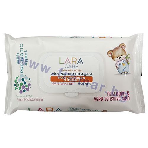 Бебешките мокри кърпички Lara Care Prebiotic са специално създадени, за да благоприятстват изграждането и поддържането на естествения баланс на кожата. Те защитават кожата на Вашето бебе и осигуряват естествено овлажняване. Можете спокойно да ги използвате още от първия ден на Вашето бебе. Подходящи са за използване върху ръцете, лицето и цялото тяло на бебето. Благодарение на съставките с пребиотично действие спомагат за размножаването на полезните бактерии и поддържането на доброто здраве на кожата. Не съдържат парфюм.