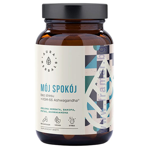 Moj Spokoj bez stresu + KSM-66 ashwagandha (Спокоен ден) на полската компания Aura Herbals е продукт, който съчетава растителни екстракти и минерали, за да подпомогне усещането за спокойствие.