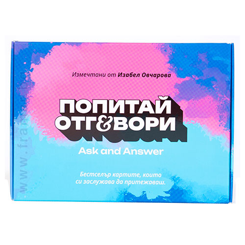 „Попитай и отговори“ е успешна и популярна игра с карти, чиято цел е да задълбочава връзките между хората. Тя помага както за сближаването на непознати, така и за укрепването на отношенията между близки приятели и роднини, като създава безценни спомени. Уникалното правило на играта е, че всеки играч не само задава въпрос от картите, но и сам отговаря на него, което насърчава искрени дискусии. Картите са двуезични (на български и английски), подходящи са за всички над 10 години и могат да се играят от неограничен брой участници или дори самостоятелно.