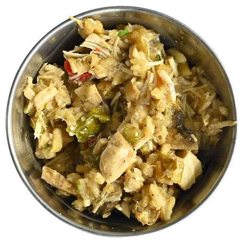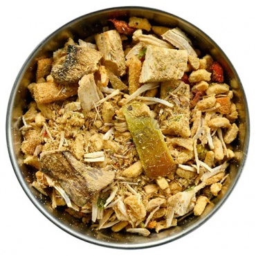 Пилешко месо филе 20.4%, стар лук, гъба Печурка, морков, ориз, зелена чушка, червена чушка, соев сос (вода, соеви зърна, пшеница, сол) 3.6%, кокосово масло, пресен лук, сол, магданоз, чесън, черен пипер, джинджифил.