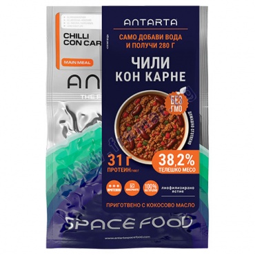 След приготвяне, чили кон карне преминава през щадящ процес на лиофилизация, който запазва естествените хранителни вещества, аминокиселини и вкусови качества без използване на добавки, консерванти или ГМО. След добавяне на вода и кратко изчакване, ANTARTA чили кон карне отново става готово ястие за консумация, осигуряващо удобен, надежден и качествен прием на истинска храна.