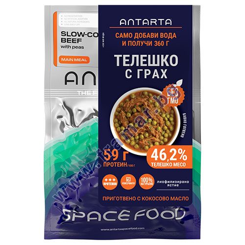След приготвяне ястието преминава през щадящ процес на лиофилизация, който запазва хранителните вещества, протеините и вкуса в концентриран вид без използване на добавки, ГМО или консерванти. След добавяне на вода и кратко изчакване, ANTARTA телешко с грах отново се превръща в готово ястие за консумация, осигуряващо удобен и надежден прием на истинска храна у дома, в офиса или по време на път.