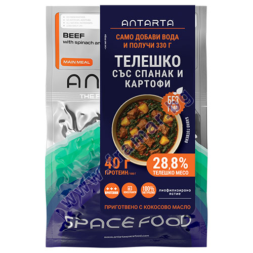 След приготвяне, ястието преминава през щадящ процес на лиофилизация, който запазва естествените хранителни вещества, без използване на добавки, консерванти или ГМО, като същевременно продуктът остава компактен и с дълъг срок на годност. След добавяне на вода и няколко минути изчакване, ANTARTA телешко със спанак и картофи отново става готово ястие за консумация, осигуряващо удобен и надежден начин за прием на истинска, пълноценна храна.Високо съдържание на протеин.