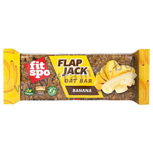 Флапджак FitSpo Banana е овесен енергиен бар с апетитни сушени бананови парченца. Овесените ядки в състава му са идеален източник на калории с нисък гликемичен индекс, които подсигуряват постоянен приток на енергия часове наред. Барът съдържа идеално балансирано количество въглехидрати, мазнини, фибри и бетаглюкани, създаващи усещане за дълготрайна ситост.