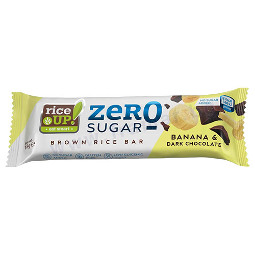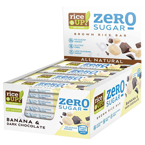 Оризовото барче RiceUp! ZERO SUGAR представлява 100% натурален продукт без глутен, приготвен от пълнозърнест кафяв ориз. Този десерт не съдържа добавена захар и се отличава с натурален вкус на банан, покрит с фин шоколад и хрупкава вътрешност. Това е леко, апетитно и здравословно изкушение за динамичното ежедневие, на което можете да се насладите без никакви угризения. Продуктът бързо ще се превърне във Вашето предпочитано нискокалорично лакомство - идеално за офиса, преди или след спорт, по време на разходка, както и за кутията с обяд на детето Ви. Оризов бар RiceUp! ZERO SUGAR притежава нисък гликемичен индекс, хапването му не предизвиква резки скокове в кръвната захар, осигурявайки постепенно и балансирано освобождаване на енергия.