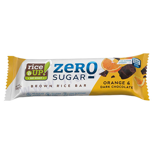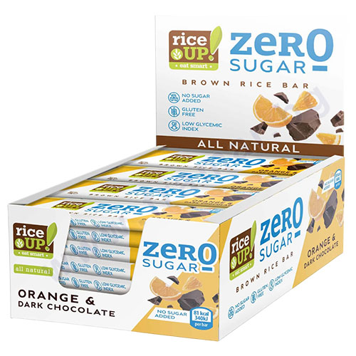 Оризов бар RiceUp! ZERO SUGAR е 100% натурално, безглутеново изкушение, създадено от пълнозърнест кафяв ориз. Продуктът не съдържа добавена захар и е глазиран с наситен черен шоколад (без захар) и ароматно портокалово масло. Това е леко, вкусно и полезно лакомство за натоварения ви график, на което можете да се насладите напълно без угризения. Този десерт бързо ще се превърне във вашия фаворит с ниско съдържание на калории, подходящ както за офиса, така и преди или след спорт, по време на планински преходи или като добавка в кутията за обяд на детето. Благодарение на ниския си гликемичен индекс, оризовият бар RiceUp! ZERO SUGAR осигурява постепенно и балансирано освобождаване на енергия, без да предизвиква резки промени в нивата на кръвната захар.