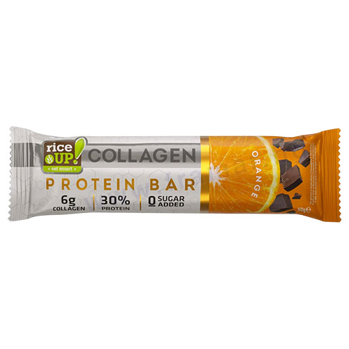 RiceUP! Collagen Bar представлява иновативен функционален десерт от ново поколение, който предлага страхотен вкус без компромиси. Със своята енергийна стойност от под 215 калории, той се превръща в перфектната междинна закуска за хора, които следят калорийния си баланс. Този бар е вълшебно съчетание от функционалност, вкус и различни текстури, гарантиращо удоволствие при всяка хапка. Продуктът комбинира мек пълнеж от млечен протеин с ухание на портокал, пласт от свеж портокалов крем без захар и хрупкави какаови криспита. Всичко това е обгърнато от истински млечен шоколад, несъдържащ палмова мазнина. Ключовият елемент в RiceUP! Collagen Protein Bar е колагенът – съставът включва 6000 мг хидролизиран телешки колаген от тип I и III.