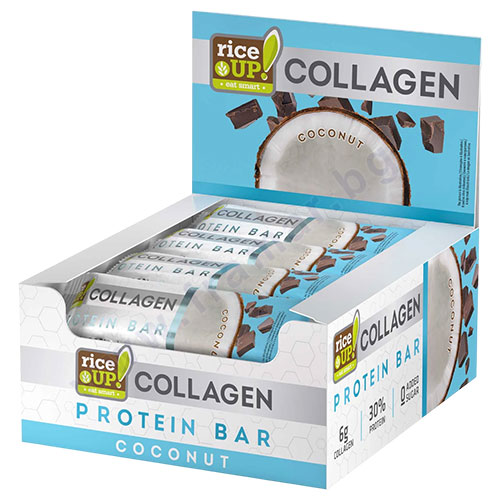 RiceUP! колагенов бар е иновативен функционален десерт от ново поколение, който съчетава отличен вкус и балансиран хранителен профил. С под 215 калории, той е перфектният избор за хора, които контролират калорийния си прием. Барът предлага хармонична комбинация от текстури, аромат и функционалност, осигуряваща истинско удоволствие при всяка хапка. В състава му се съчетават мек протеинов пълнеж с екзотичен кокосов вкус, слой фин кокосов крем без добавена захар и хрупкави какаови криспита, покрити с истински млечен шоколад без съдържание на палмова мазнина. Формулата е обогатена с 6000 mg хидролизиран телешки колаген тип I и III.