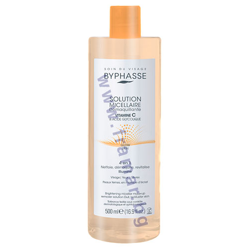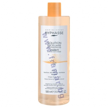 Мицеларен разтвор за почистване на грим и ежедневни замърсявания на лицето. Мицеларният разтвор Byphasse с витамин C, обогатен с гликолова киселина, озарява матовата кожа, лишена от блясък. Осигурява лека химическа ексфолиация за сияен и по-равномерен тен.