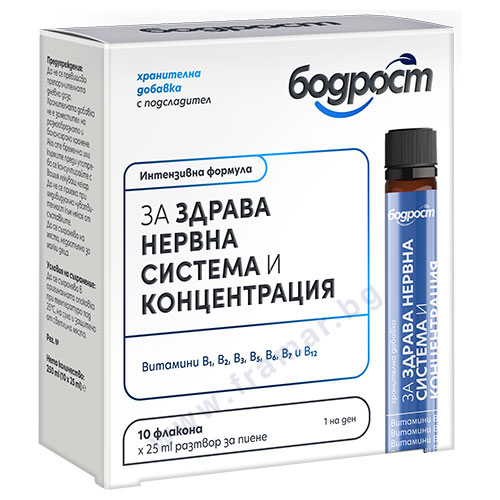 Бодрост за здрава нервна система и концентрация е хранителна добавка с интензивна формула, включваща витамини от група B (B1, B2, B3, B5, B6, B7 и B12), подпомагащи организма в периоди на повишена умствена и физическа натовареност, стрес, честа умора и липса на концентрация. Витамините от група B допринасят за нормалното протичане на метаболизма и производството на енергия. Освен това, те подпомагат нормалния метаболизъм на основните хранителни вещества (белтъчини, въглехидрати и мазнини). Витамините B1, B2, B3, B6, B7 и B12 допринасят за нормалното функциониране на нервната система и нормална психична функция. Витамините B2, B3, B5, B6 и B12 допринасят за намаляване на чувството за отпадналост и умора.