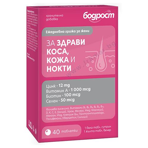 Бодрост за здрави коса, кожа и нокти е хранителна добавка с комплексен състав от витамини, минерали и растителни екстракти. Продуктът съдържа 2 вида таблетки с различен състав – бяла таблетка „ден“ и жълта таблетка „нощ“. Комбинацията от важни минерали като калций, селен, цинк и витамини от групата В осигурява подкрепа на клетъчната регенерация, укрепва косъма и ноктите, и подпомага защитните функции на кожата.