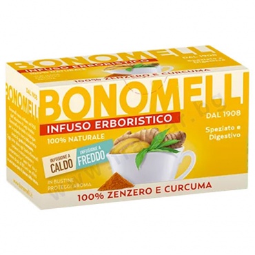 Билков чай с корени от джинджифил и куркума. Изцяло натурална формула, без добавени допълнителни съставки. Рецептата на италианския производител Bonomelli черпи вдъхновение от утвърдените традиции на източната култура.
