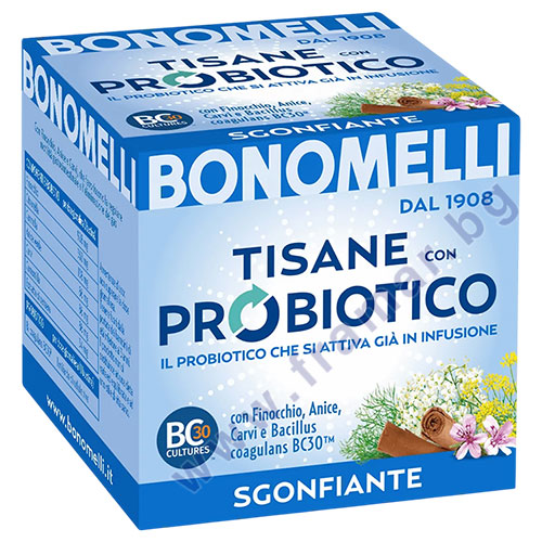 Чай от билки с добавен пробиотик от италианската марка Bonomelli. Формулата съчетава внимателно подбрани растителни съставки - резене, лимонова трева и канела касия, допълнени от лайка, зелен анасон и джинджифил. Съставът е обогатен с 1 милиард живи клетки от пробиотика Bacillus Coagulans BC30™, които допълват билковата комбинация.