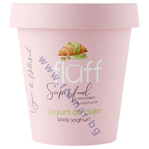 Нежният йогурт за тяло Fluff с аромат на шамфъстък дълбоко хидратира, подхранва и омекотява кожата, като я оставя кадифено гладка и приятно ароматизирана.