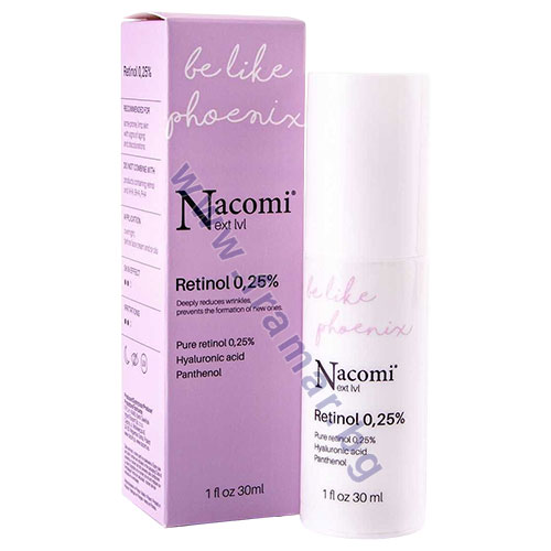 NACOMI NEXT LEVEL Серум с ретинол 0,25% е нежен, но ефективен серум, който стимулира клетъчното обновяване и помага за изглаждане на бръчките и подобряване на текстурата на кожата.