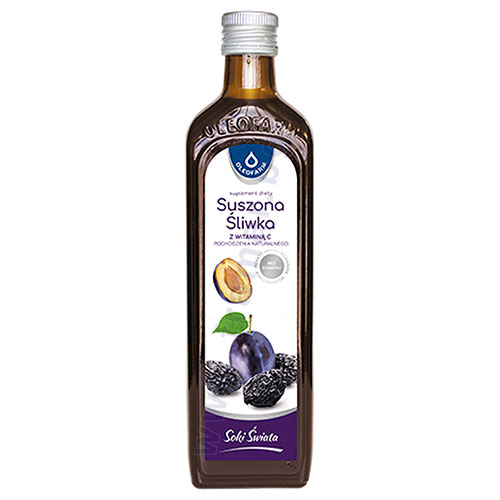 Течната хранителна добавка СУШЕНИ СЛИВИ + ВИТАМИН C сок 490 мл от полския производител Oleofarm е разработена да съдейства за доброто състояние на стомашно-чревния тракт. Тя допринася за равновесието на микрофлората в червата, подпомага обмяната на липидите и благоприятства цялостния комфорт на храносмилателните процеси.