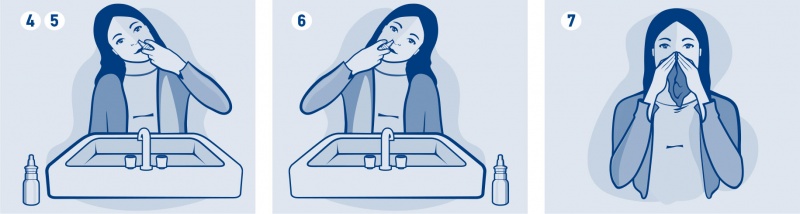 7. Извадете спрея от ноздрите, върнете се в изправено положение, докато разтворът действа за няколко секунди, и след това издухайте носа.